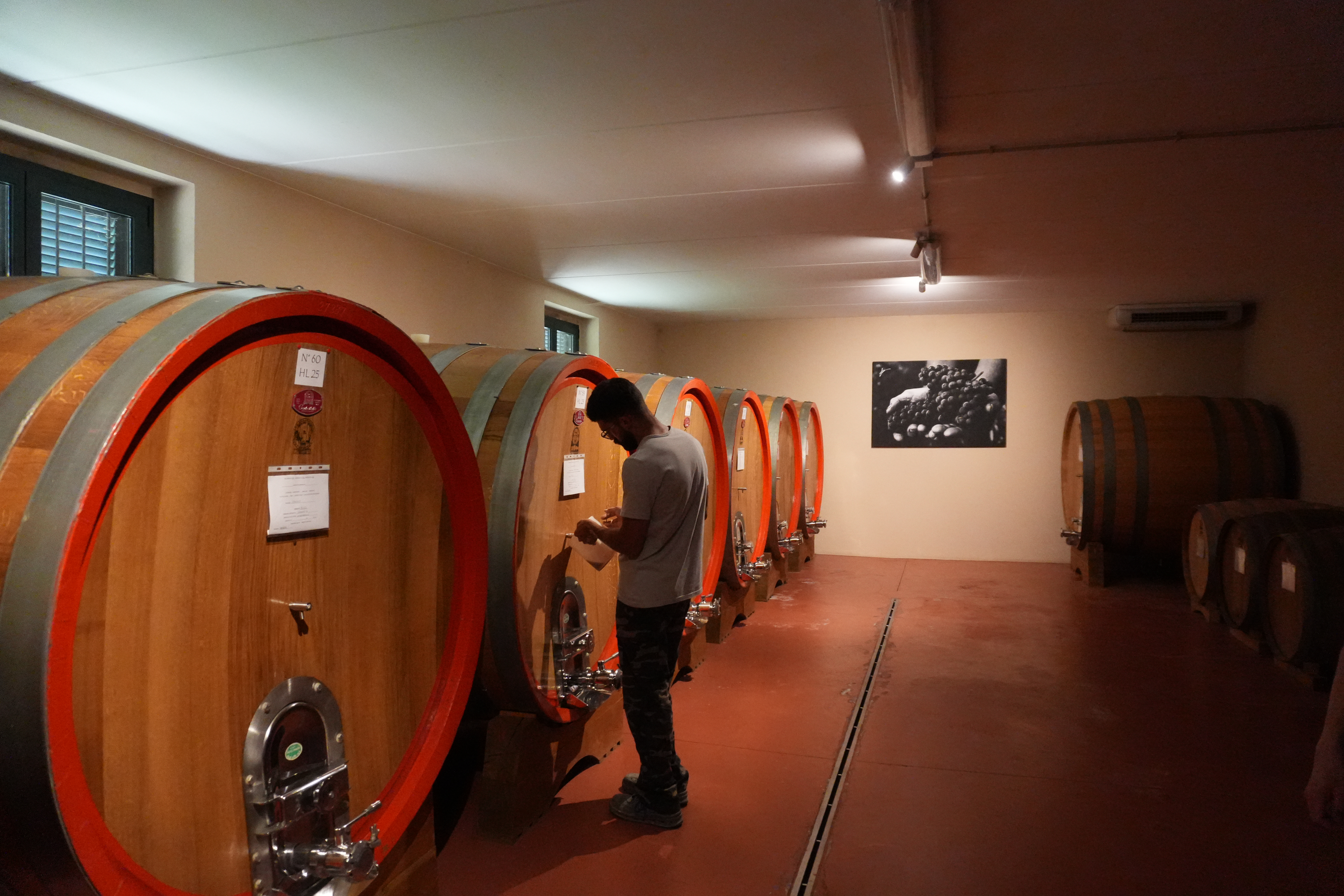 8月17日,在意大利拉莫拉镇,马斯卡雷洛家族酒庄负责人法比奥·马斯卡雷洛在酒窖里工作。新华社记者张馨文摄